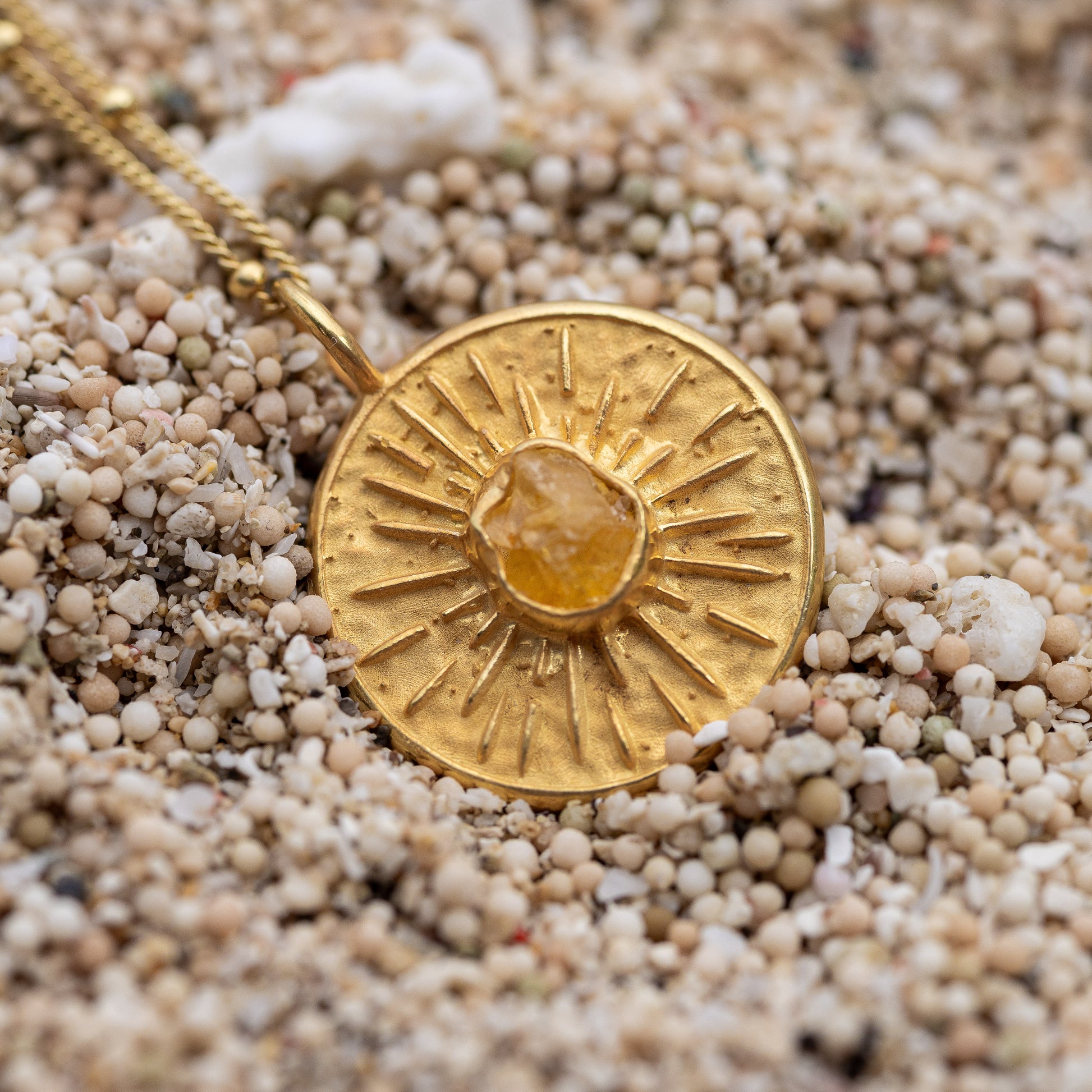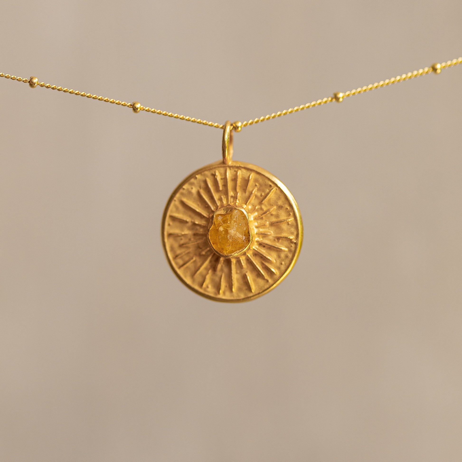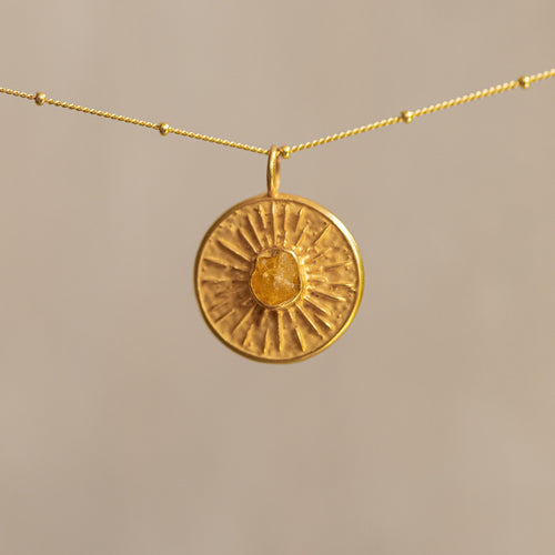 At the center shines a citrine – the stone of the sun, optimism and abundance.
