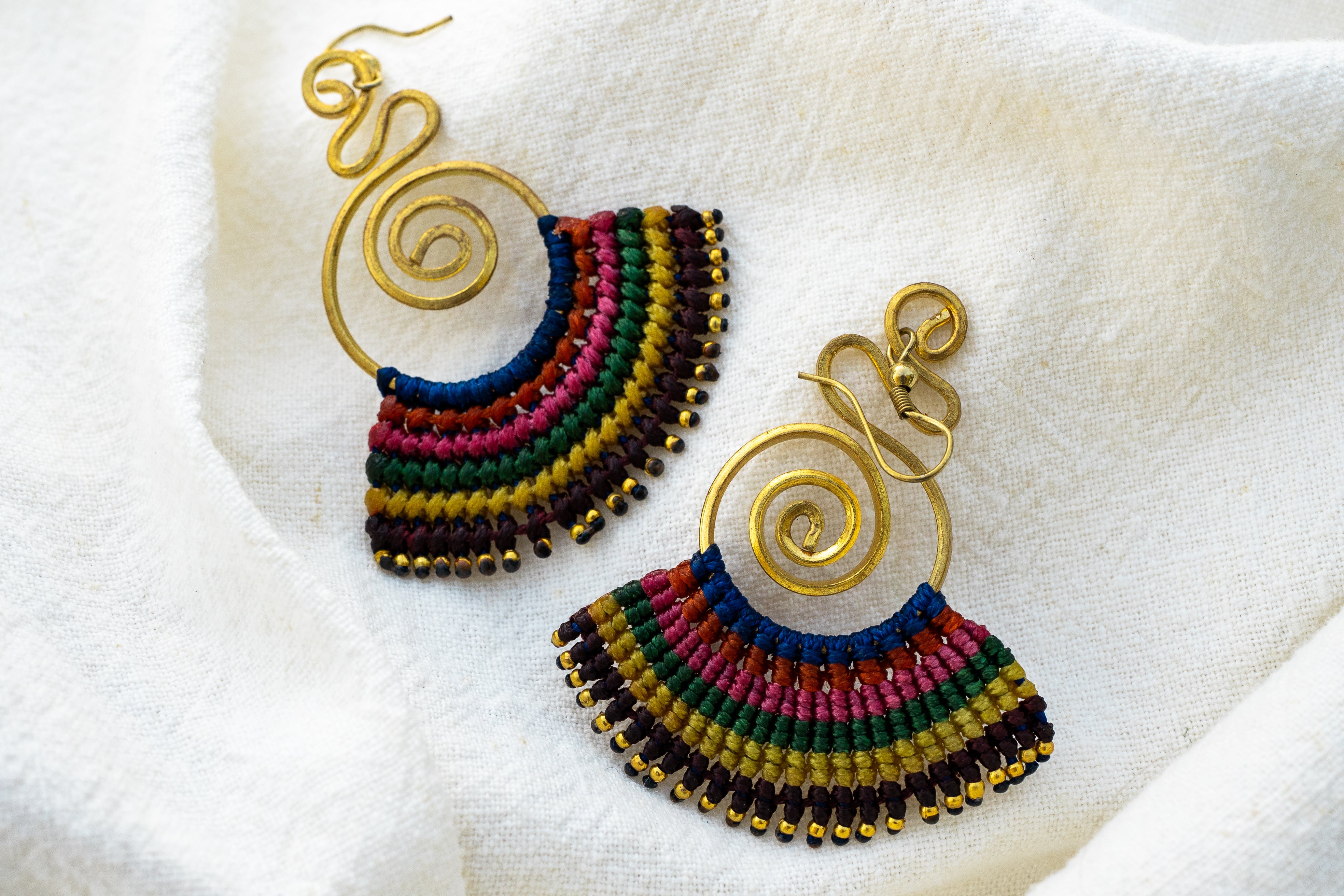 Aus 100% Messing gefertigt und in filigraner Makramee-Technik umwebt, sind sie Ausdruck von Handarbeit, Geduld und Liebe zum Detail.