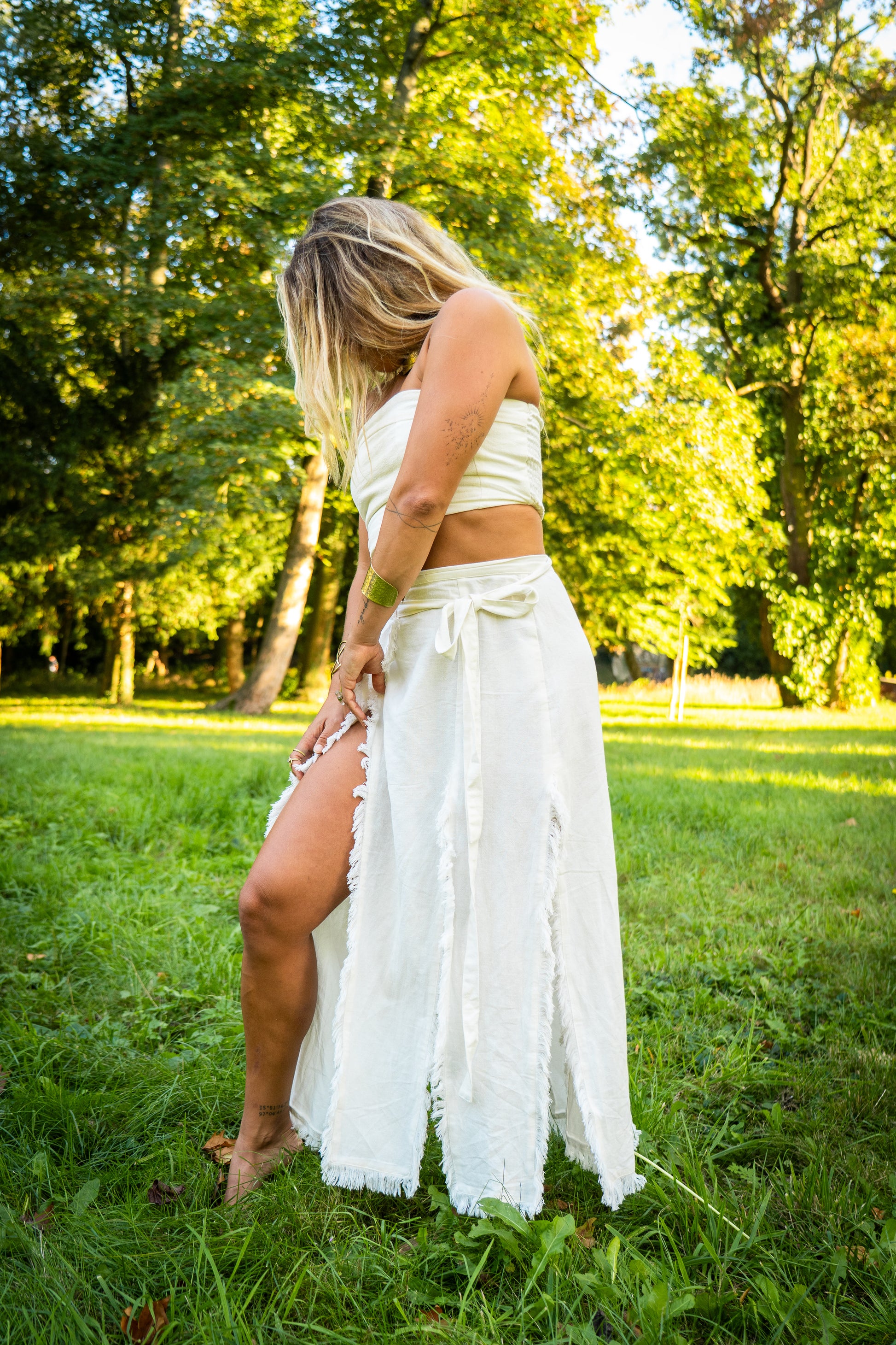 Der Gleam Skirt ist ein Wickelrock mit fließendem Fall, gefertigt aus weicher Bamboo Cotton. Der Saum mit feinen Fransen verleiht ihm einen verspielten, fairy-inspirierten Look – frei, feminin und naturverbunden.