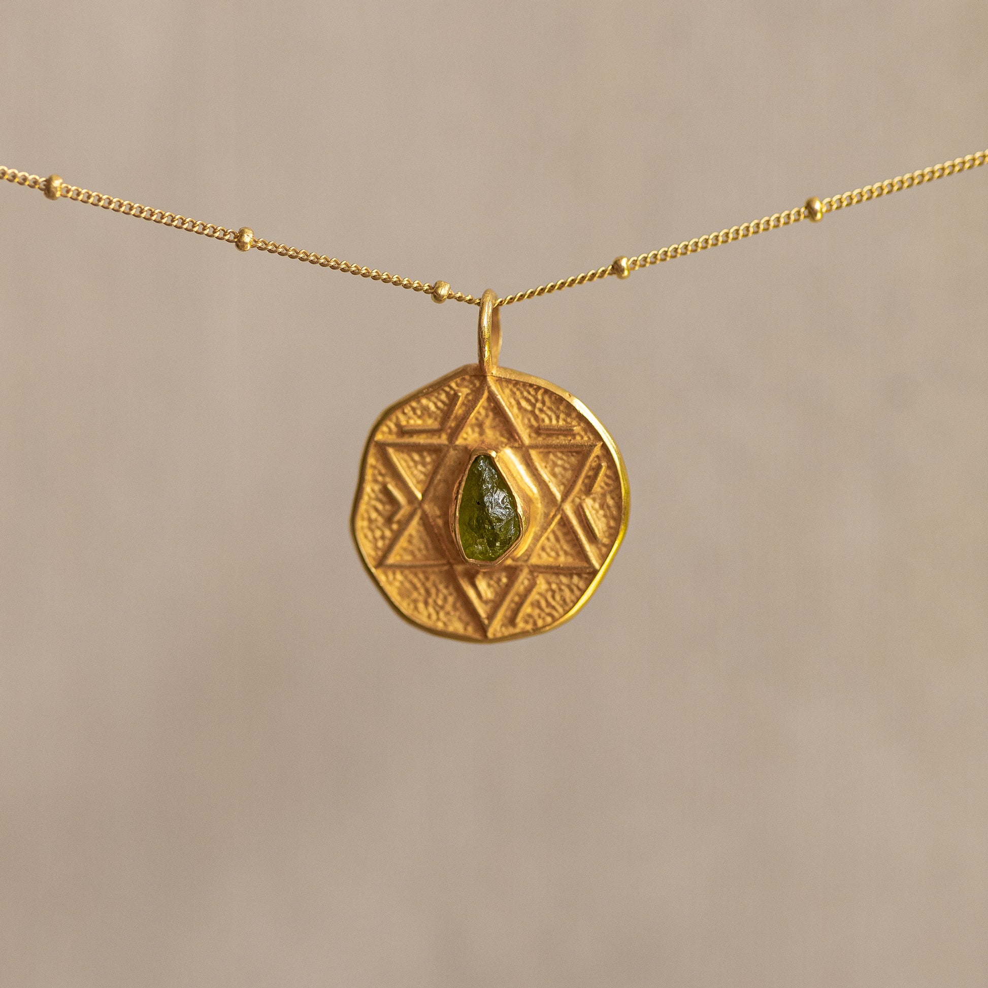 Im Zentrum strahlt ein Peridot – der Stein des Lichts, des Wachstums und der Erneuerung.