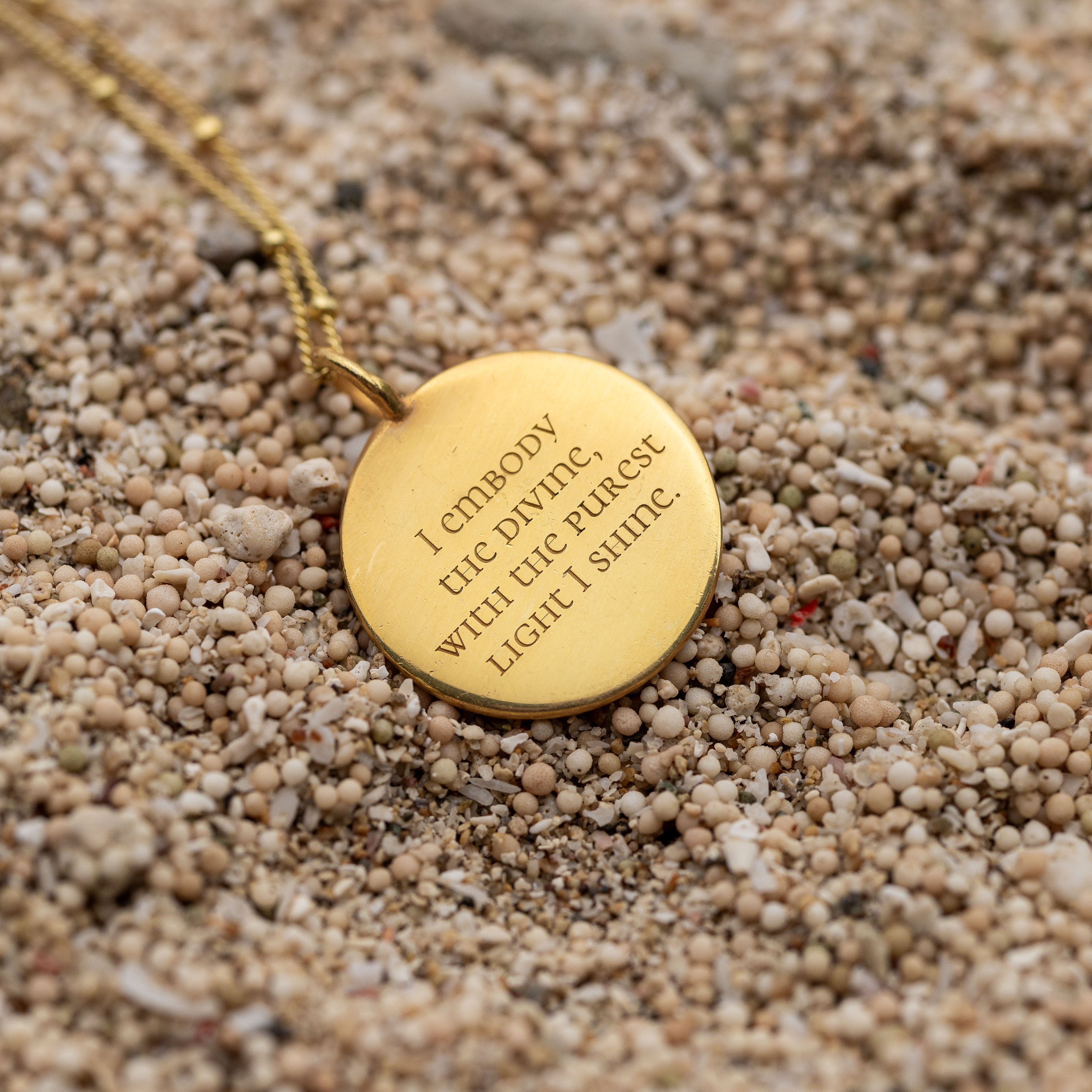 • Rückseitige Gravur: „I embody the divine, with the purest light I shine.“